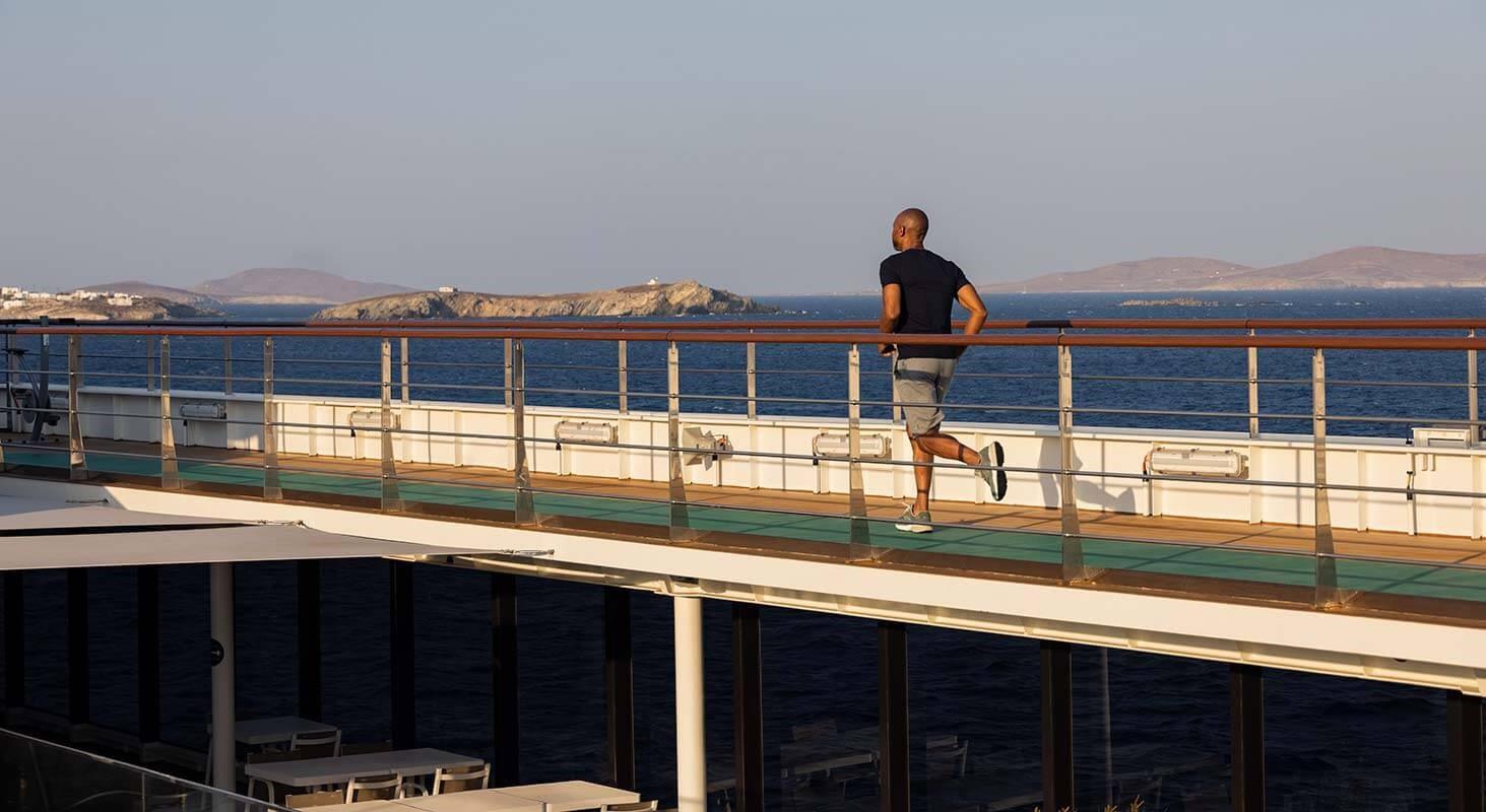 Take a lap or two at the running track on the top deck, complete with breathtaking horizons and exercise stations located throughout.